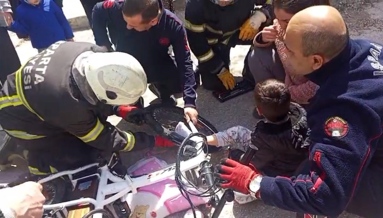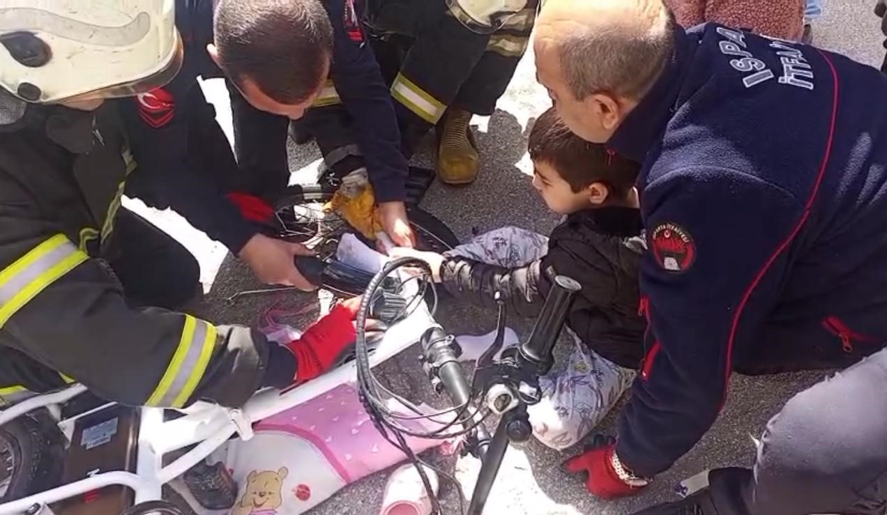 Isparta’da bir çocuğun ayağı bisiklete sıkıştı. Olay yerine gelen itfaiye ekipleri, çocuğu kısa sürede kurtardı.